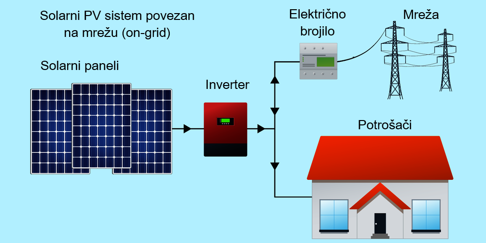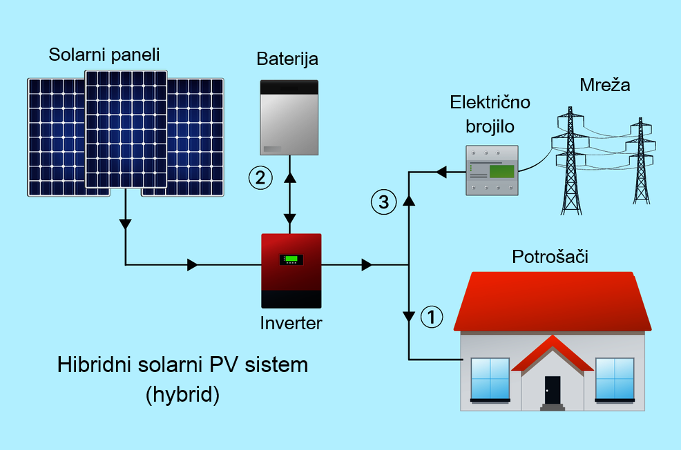 su kombinacija off-grid i on-grid sistemaimaju, sa mogućnoćšu skladištenja energije u baterije i/ili plasiranje u elektro distributivnu mrežu.